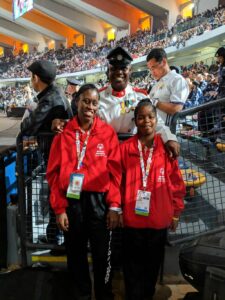 T&T Special Olympic athletes LaToya Charles, left, T&T torchbearer Michael Leon Hazard, centre, and Tershana Tempro also from athletics at the Special Olympics World Games opening ceremony yesterday in Abu Dhabi.